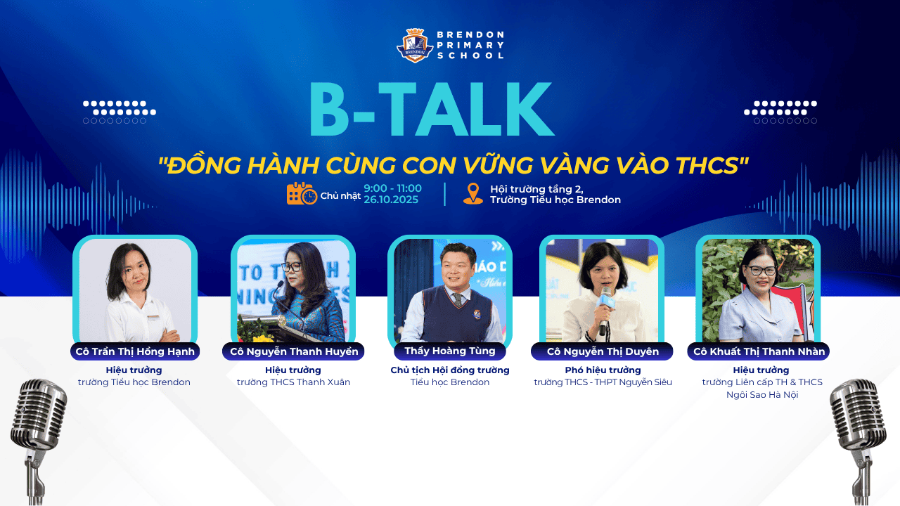 Xin kính mời Quý phụ huynh tham dự HỘI THẢO B-TALK THÁNG 10 với chủ đề “Đồng hành cùng con vững vàng vào THCS”. Sự kiện có sự xuất hiện của các diễn giả đặc biệt: